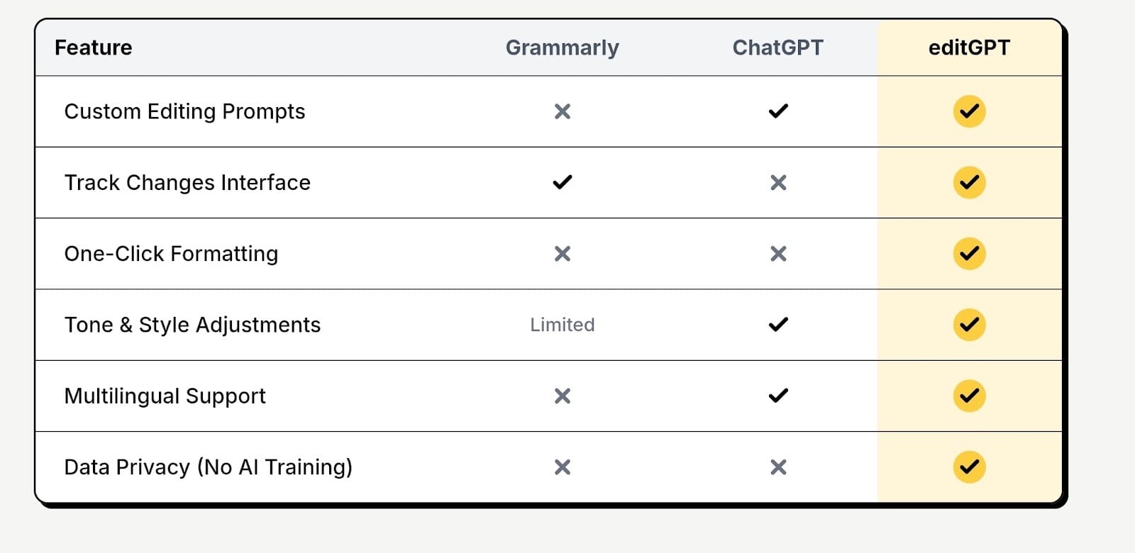 Comparison Table: editGPT vs Other AI Writing Tools