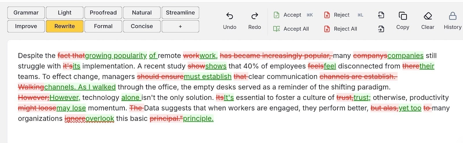 This tool is an editor, not a generator. It’s also not the best fit if you absolutely hate the "track changes" style of working and just want your mistakes to disappear silently in the background without you ever seeing them to check.